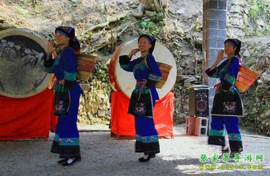 ①仙人合竹:從游客中挑選一男一女,兩人面對(duì)面相隔10米左右站立,然后將兩根竹竿用雙手抓住,夾在腰間,巫師念咒之后,兩根竹竿慢慢合在一起。這一道巫術(shù)要想成功的話,對(duì)女配角的挑選很講究:月經(jīng)期間是不行的。仙人合竹是以前湘西人判斷夫妻間能否白頭偕老的法術(shù)。