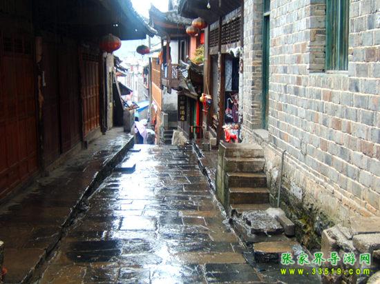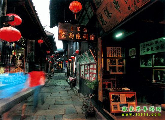 拾級而上,山路一般的陡峭。從碼頭開始綿亙而上的石階,那是一條長達五里貫穿古鎮(zhèn)的青石板路,它沒有名字,于是人們就直接管它叫五里長街。踏上古街,似乎踩在被悠長歲月遺落的碎片上面。不知不覺走到掛有“土家觀瀑吊腳樓”牌匾的民俗博物館前,從手搖腳踏的棉花機、閹豬鳴號的羊角到世代相傳的雕花牙床,近百件散發(fā)著鄉(xiāng)土氣息的民間用具,展示著土家族古老豐富的歷史??醋o人說,這是一位土家族年輕人爬山涉水收集來的,靜靜地訴說著這個小村古老的過去。這棟三層的小樓,一半落在河岸上,另一半?yún)s是由水泥柱支撐著,水泥柱直插河底,任水流日日夜夜地沖刷,小小的吊腳樓仍穩(wěn)穩(wěn)當當站在那里,任憑時間的流逝。好聰明的土家人,巧借一片水面,竟建起了如此妖嬈的住房。