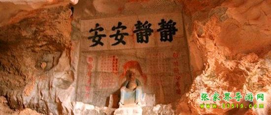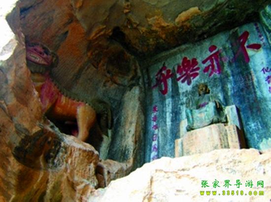 玉皇洞石窟位于張家界城西約7公里的麻空山南壁,為清代本地鄉(xiāng)紳李京開獨(dú)資捐修。李京開又叫李五瑞,別名九洞樂(lè),號(hào)識(shí)破生。他生于乾隆七年(公元1742年),道光乙酉年(1825年)去世,享年83歲。李先生家道殷實(shí),富甲一方。少時(shí)勤奮讀書,頗有才華,數(shù)十年奔波仕途,但屢試不第,官場(chǎng)無(wú)望,于是看破紅塵,另尋安慰,請(qǐng)工匠,耗巨資,憑借麻空山天然溶洞,按上、中、下方位布局,巧妙構(gòu)思,開鑿成“天堂”、“人間”、“地府”三層共八個(gè)洞。另外,在離此約3公里的峰泉洞另鑿一洞,故有“九洞樂(lè)”別名。玉皇洞石窟上層為玉皇洞,人間層有玉金洞、毫筆洞、墨池洞、虎龍洞、雄獅洞、孔圣洞,地府為因果洞,八洞組成一個(gè)完整的混沌世界。居八洞之首的玉皇洞,雕有玉皇大帝神像,意為“天堂”至尊,統(tǒng)帥中層的“人間”和下層的“地府”,故八洞統(tǒng)稱玉皇洞。此洞于1799年動(dòng)工,到1807年完成,歷時(shí)八年。洞內(nèi)雕鑿了一些歷史人物的神像以及大量詩(shī)詞匾對(duì),不僅石雕精湛獨(dú)特,雕像神韻生動(dòng),書法遒勁大氣,而且在石窟藝術(shù)的主題構(gòu)思上,抒發(fā)了主持捐修者李京開懷才不遇、憤世疾俗、向往太平盛世的情感,鞭達(dá)了腐朽的科舉制度,對(duì)于研究清代社會(huì)和科舉制度,以及當(dāng)時(shí)一般讀書人的思想情感,都具有一定的史料價(jià)值。整座洞窟東西長(zhǎng)300余米,現(xiàn)存石像19尊,石刻50多處,是湖南省唯一保存完好的石窟藝術(shù)群,1959年玉皇洞被列入湖南省重點(diǎn)文物保護(hù)單位。