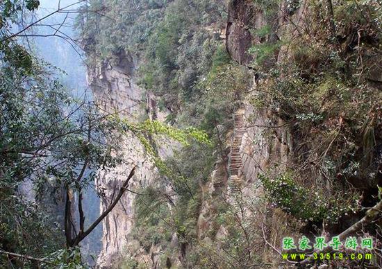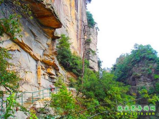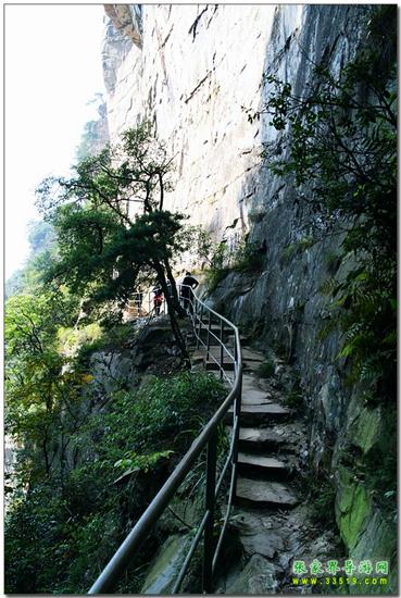 由群仙開宴景點(diǎn)沿石徑蜿蜒而下約200米處,一巨峰于半腰分裂,內(nèi)可行人,長300米,寬0.1-1米。南側(cè)懸崖峭壁,深不見底。北側(cè)石壁高50米,抬頭不見其頂。人行其內(nèi),如置身空中長廊。廊中虬松懸崖,亂云飛渡,山風(fēng)呼嘯。廊之東、南和西南三面峰立如林,或如城墻,或加堡壘,各呈奇舉。