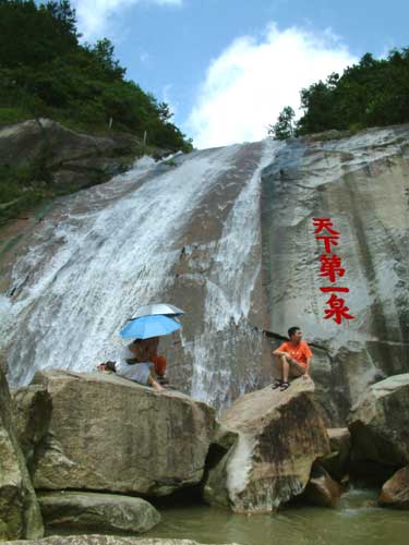水簾洞瀑布源頭,在紫蓋峰的泉水。三支泉水匯集一起,流入水簾洞上方谷地。谷地闊三丈,原是梁朝的九位真人白日飛升的棲息之地,后建造九仙觀。九仙觀附近有太陽(yáng)泉、洗心泉、洞真源、仙人池等。相傳泉水深不可測(cè)。泉水從石壁上飛流直瀉,發(fā)出雷鳴般的聲音,聲傳十里。明朝張居正游此地后說(shuō):“瀑泉灑落,水簾數(shù)疊,掛于云際,垂如貫珠,霏如削玉”。確實(shí),它從絕壁上噴瀉下來(lái),寬達(dá)三太,高五十余米,瀉珠濺玉,仿佛一幅巨大的白布簾,在石壁當(dāng)中被亂石嶙巖擋住,然后再?gòu)氖p里屈曲折射,跳躍出來(lái),滿谷水花四濺,閃爍著晶瑩奪目的光彩。水簾絕壁下的碧潭,天上的云彩和兩邊的蒼翠的山巒,構(gòu)成一幅美麗的山水畫。明朝張居正作《水簾洞》一贊道:“誤疑瀛海翻瓊浪,莫擬銀河倒碧流;自是湘妃深隱處,水晶簾掛五去頭”。這首詩(shī)可說(shuō)是寫出了水簾洞的光、聲、影三絕的奇景了。