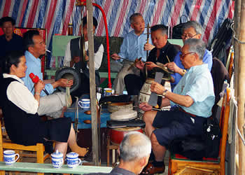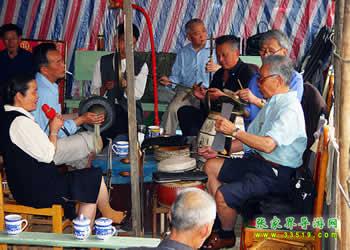 圍鼓(含嗩吶)。又稱(chēng)打鎦子、打排鼓,是民間紅白會(huì)中不可缺少的樂(lè)器。一般7人演奏,樂(lè)器有一鼓、一大鑼、一公鑼、兩副鈸、兩嗩吶。其詞曲紅白會(huì)通用,以鼓和嗩吶上系紅、白布為分別標(biāo)記(結(jié)婚不打“四字鈸”曲)。史傳的圍鼓詞有《撩子》、《火鋪》等,《撩子》分《一二三》、《閃翅》、《堆羅漢》、《反落花》等十章,《火鋪》也分《三槍》、《四進(jìn)門(mén)》、《八哥洗澡》、《蓮魚(yú)吐絲》等十章,嗩吶詞有《八十正宮》調(diào)等。在農(nóng)村,圍鼓是最普及的樂(lè)器,每逢紅白喜事都有圍鼓和嗩吶表演。