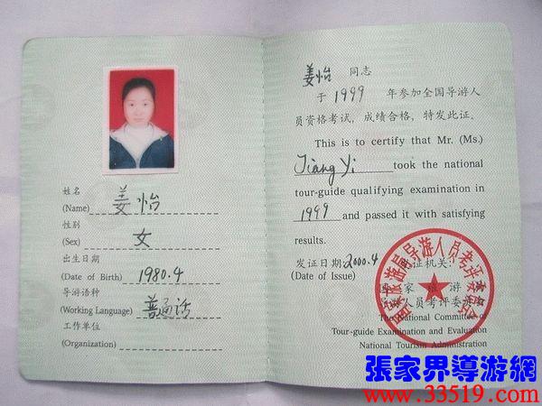 | 姜怡,女,導(dǎo)游員資格證書編號:Hun990125。 大專學(xué)歷,自99年9月森林保護節(jié)前開始從事導(dǎo)游工作,同年十二月參加全國導(dǎo)游員資格考試,并以優(yōu)異成績?nèi)〉谩皣鴮?dǎo)證”,現(xiàn)為張家界華天國旅旅行社的專職導(dǎo)游員。整個帶團期間,無論團隊或散客,未出現(xiàn)一次旅游事故或游客投訴事件,普遍反映帶團效果好。 | 導(dǎo)游自述