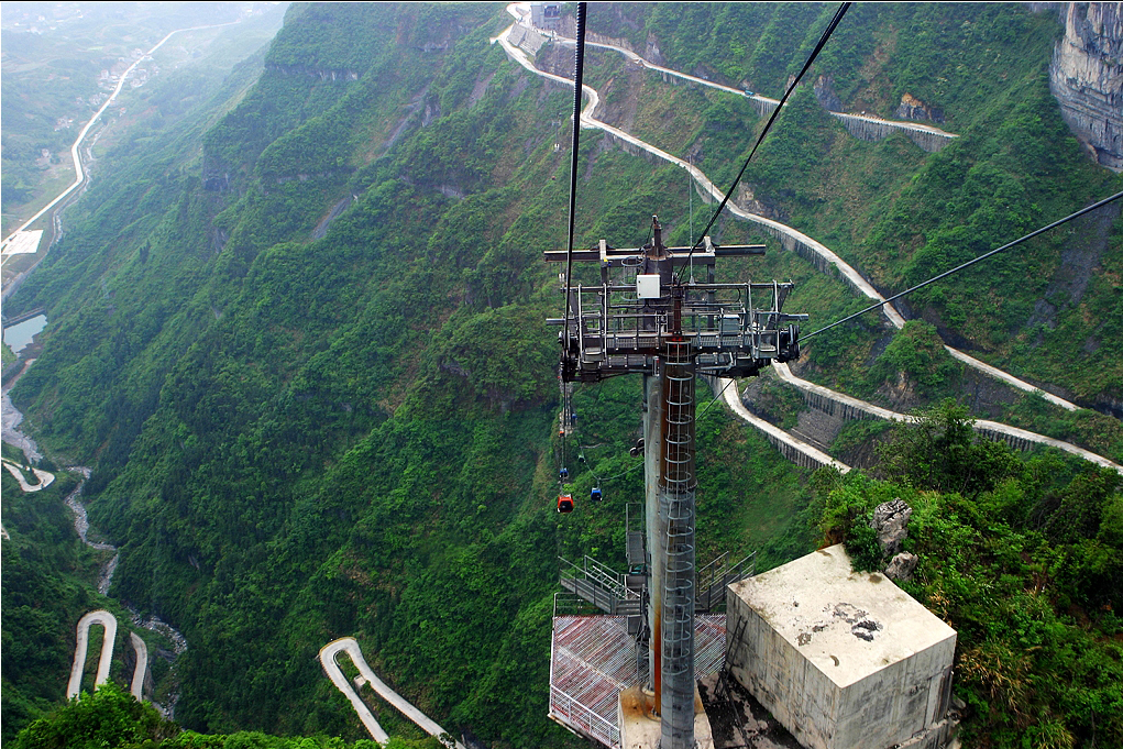 天門索道:索道線路斜長(zhǎng)7455米,上、下站水平高差1279米,是世界最長(zhǎng)的單線循環(huán)脫掛抱索器車廂式索道,猶如一道彩虹飛渡“人間” “天上”,又象一條巨龍騰翔素云蒼穹,依山籍壁,拔地沖天,蕩氣回腸,恢宏壯觀,成為天門山旅游風(fēng)景區(qū)“四大奇觀”之一。
