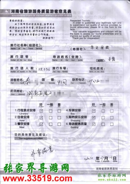 2010年7月13日岳陽秦先生一行16位旅游質(zhì)量反饋