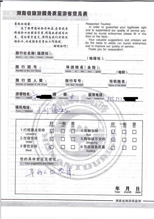 2011年3月20日劉先生旅游服務(wù)質(zhì)量反饋:導(dǎo)游服務(wù)很熱情