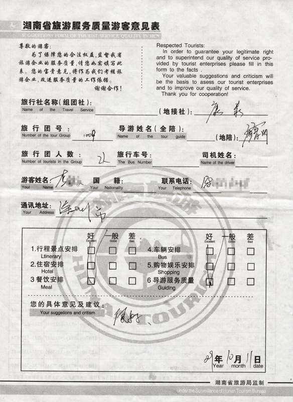 2009年10月9日深圳李先生一行2人質量接待反饋單: