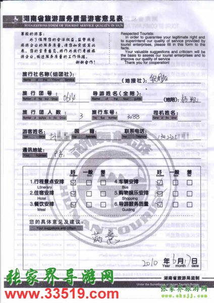 2010年6月17日廣東胡小姐一行3位旅游質(zhì)量反饋